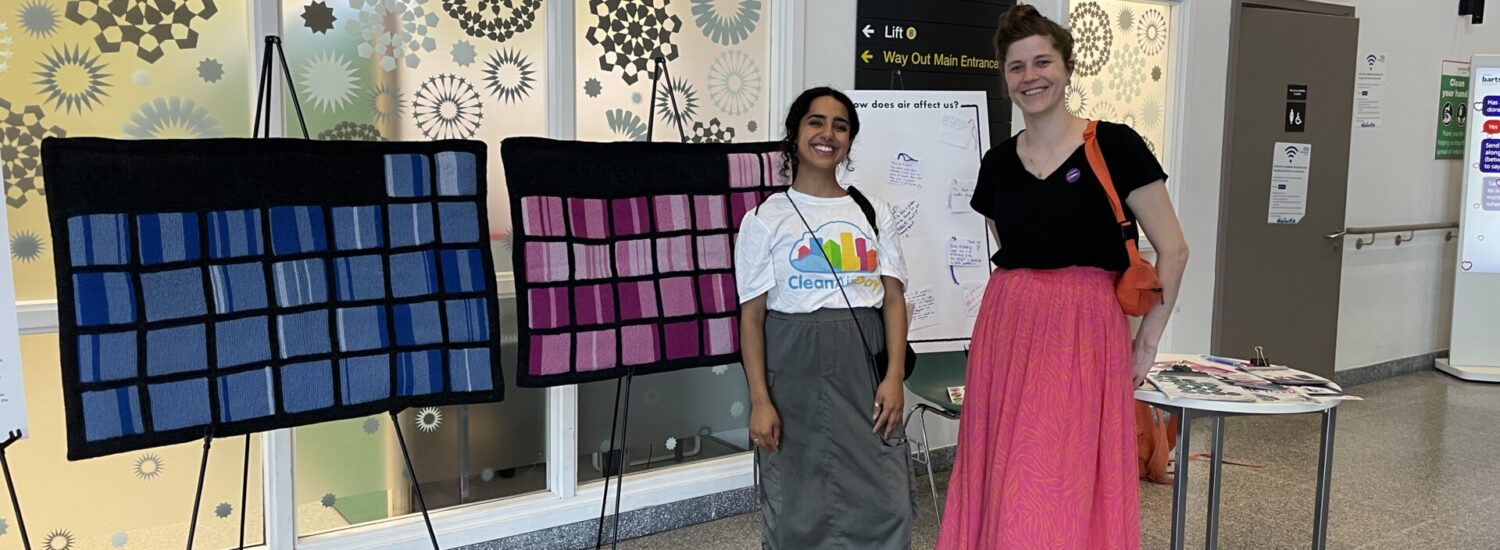 On Thursday 20 June it was Clean Air Day, the UK’s largest air pollution campaign. This is run by Global Action Plan. To promote this day and to stimulate local debate and discussion around air quality, samples of our knitted data popped up at three locations across Tower Hamlets. This included: